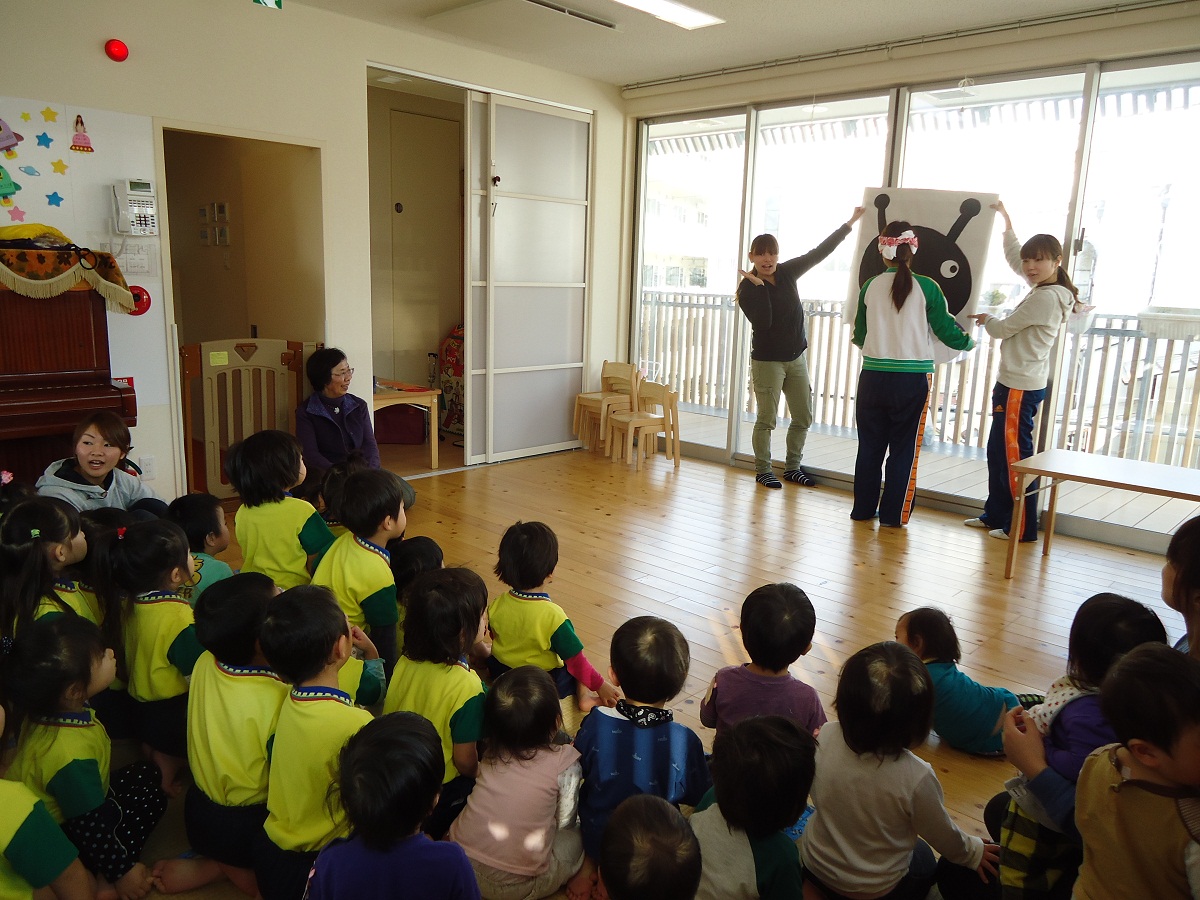 地域のお友だちと鏡びらきをしたあと、お正月遊びをしました。先生の福笑いはみんなで“もっと右”“もっと上”って教えてあげたけど、ちょっとおもしろいアンパンマンとバイキンマンになったよ。おもちつきの時につくった鏡もちを小さく切っておぜんざいにいれました。甘くておいしかったよ。